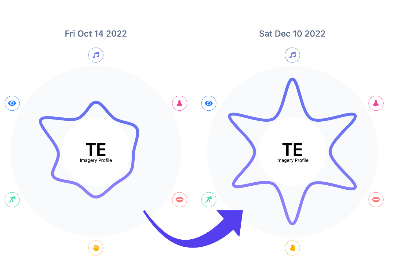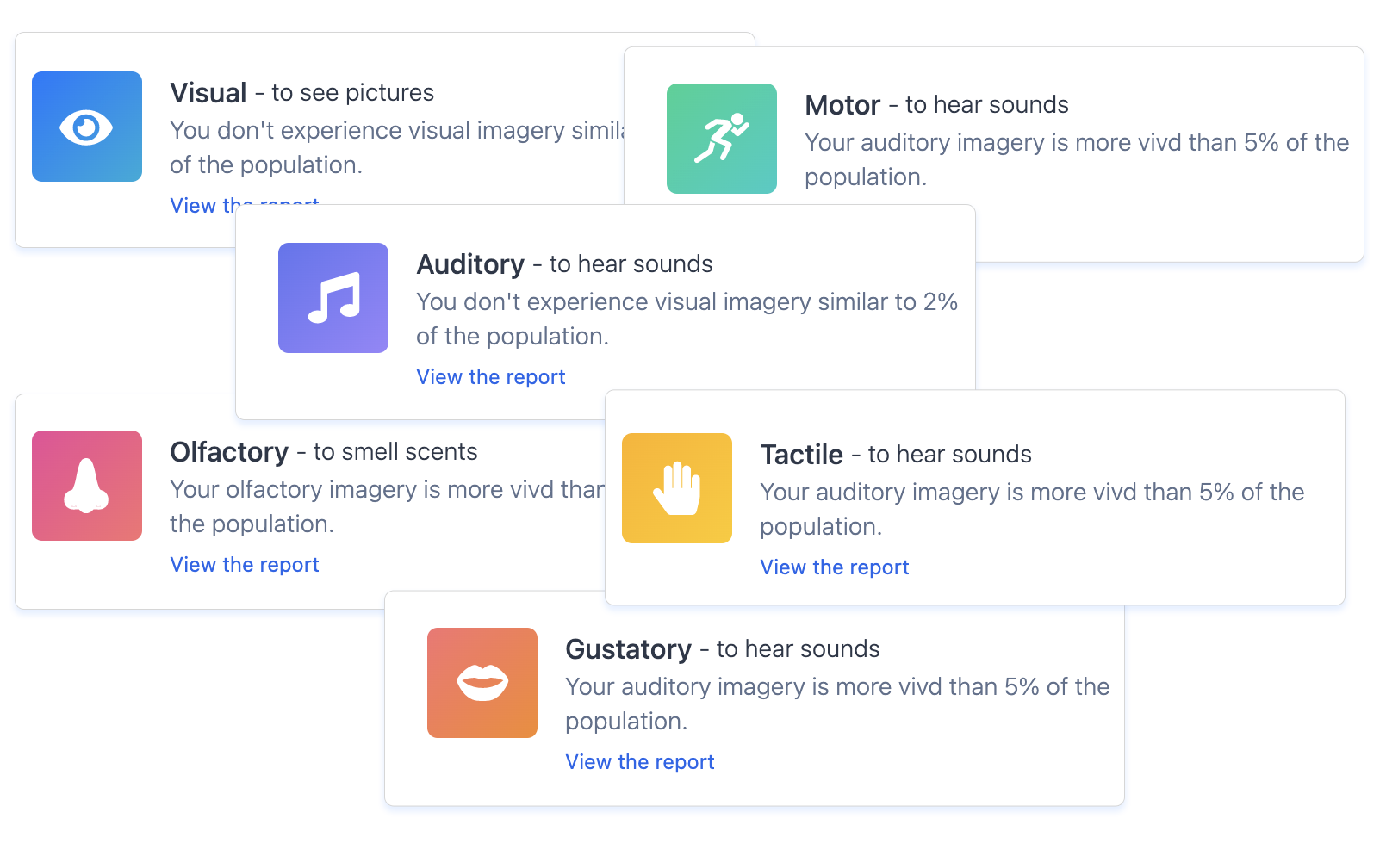 Receive a snapshot of your unique Imagery Profile to see how vivid your sensory imagination is across the different senses.